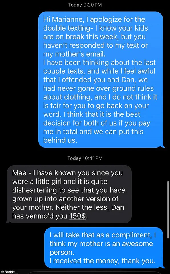 Mae’s account paints a picture of a seemingly routine babysitting gig that turned into a moral and financial dispute, with the teenager insisting she was unfairly penalized for her wardrobe choice.