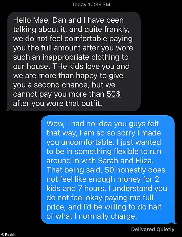 The kids love you and we are more than happy to give you a second chance, but we cannot pay you more than $50 after you wore that outfit.’ The message, which was accompanied by screenshots of the exchange, quickly went viral, with many users questioning the family’s judgment and the ethics of withholding payment based on a teenager’s clothing choice.