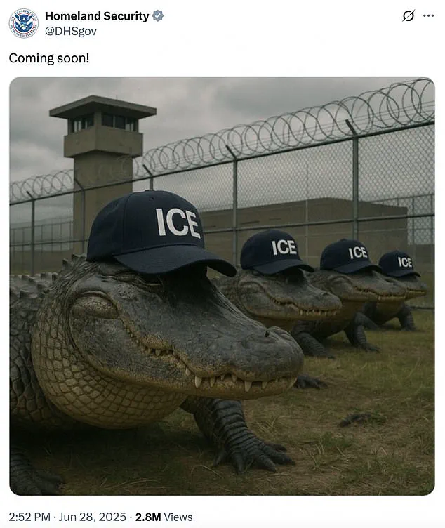 The Department of Homeland Security stoked fear with an AI-generated meme showing snarling alligators in ICE baseball caps patrolling the swampy grounds of the future facility dubbed ‘Alligator Alcatraz.’ The image, which quickly went viral, became a symbol of both the government’s enforcement priorities and the controversy surrounding the facility’s location in the Florida Everglades.