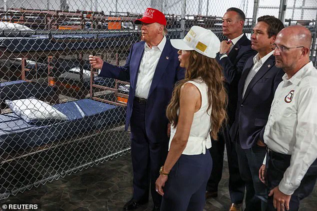 Constructed on seized land with only tents and trailers, the site sits adjacent to an 11,000-foot airstrip, a strategic asset for what Florida Governor Ron DeSantis has called ‘rapid deportation operations.’ ‘You literally drive them 2,000 feet, put them on a plane and then they’re gone,’ DeSantis said during a recent tour, emphasizing the facility’s potential to expedite removals to third countries.