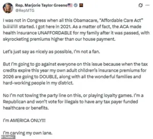 Greene’s tweet, which Kimmel highlighted during his monologue, detailed her personal stake in the issue. ‘I’m going to go against everyone on this issue because when the tax credits expire this year my own adult children’s insurance premiums for 2026 are going to DOUBLE, along with all the wonderful families and hard-working people in my district,’ she wrote. ‘No I’m not towing the party line on this, or playing loyalty games.’ Kimmel, visibly taken aback by her argument, responded with a mix of sarcasm and reluctant admiration. ‘I know this sounds crazy, but I will say it for the second time in a month: Marjorie Taylor Greene is right.’ He followed with a self-deprecating quip: ‘I know, I need something to wash out my mouth.’