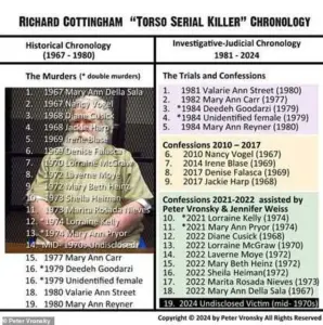 Numbers 10 – 19 in the green portion were the confessions Vronsky was able to get from Cottingham from 2021 – 2022 with the help from a victim’s daughter, Jennifer Weiss.