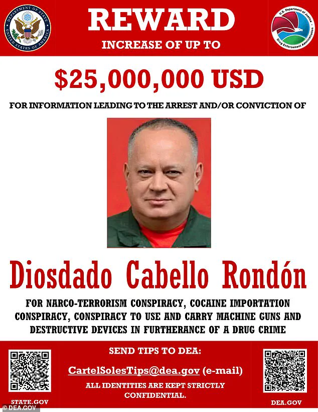 The US Department of State has issued an urgent ‘wanted’ poster, shown above, for Cabello Rondón, 62, who is Venezuela’s Minister of Interior, Justice and Peace