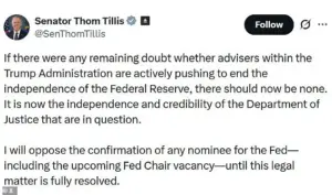 Tillis, a prominent Republican and member of the Senate Banking Committee, has vowed to block any future Fed nominees until the matter is resolved, warning that the probe threatens the independence of both the Federal Reserve and the Justice Department.
