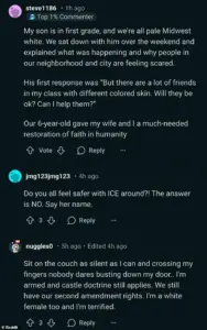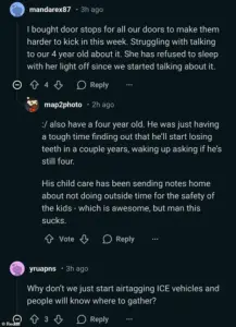 One user, a self-described ‘white, blonde, blue-eyed, US citizen,’ detailed how they had rehearsed a scenario with their three-year-old, teaching the child to ‘run to the safe room’ if an ICE agent knocked on the door.