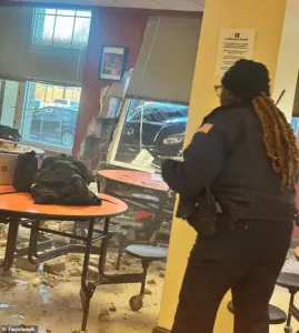 Manning’s video shows the stunned aftermath: the front of the car lodged motionless in the cafeteria, tables overturned, and students staring in horror at the destruction. ‘Even people on the other side of the cafeteria, a lot of people were shaken up and still didn’t know what was happening in the moment,’ Manning said, describing the collective shock that gripped the room.