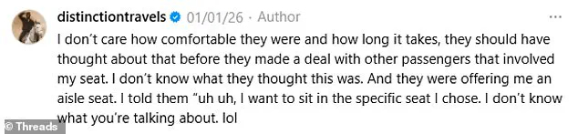 Nothing surprises me except their shock at being told “No.”’ Others echoed similar sentiments, with one passenger stating, ‘I choose my seats, I’m tall, and I’m sure not going to have a whimsical person change it on me just because.’