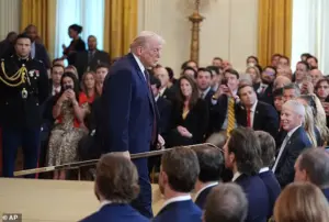 Trump, however, used the occasion to pivot back to his own agenda, drawing comparisons between the team’s ‘power’ and the strength of the U.S. military. ‘You hate standing here with all this power behind you,’ he told the players, before adding, ‘But I got power too.