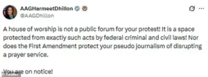 The message was clear: the federal government would not tolerate what Dhillon described as a violation of both religious freedom and public order.