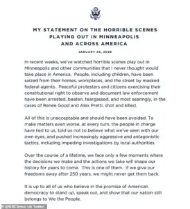 Clinton’s comments, however, went beyond condemnation, directly targeting the administration’s response. ‘To make matters even worse, at every turn, the people in charge have lied to us, told us not to believe what we’ve seen with our own eyes, and pushed increasingly aggressive and antagonistic tactics,’ he wrote, accusing officials of systematically undermining public trust.