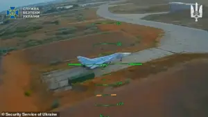 Dramatic footage, allegedly captured by Ukraine’s Security Service (SBU), shows the drones striking in a coordinated assault that has sent shockwaves through Moscow’s defense establishment.