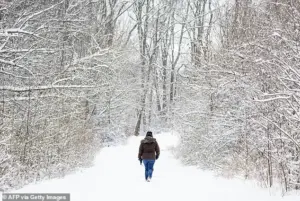 Portia Latrice Jones, 44, was found dead while hiking a trail in Annapolis, Maryland last Wednesday. A woman is pictured here walking through a snow-covered path in Centreville, Maryland last year