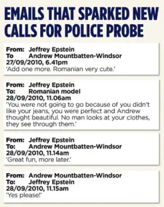 The emails paint a chilling picture of Epstein’s modus operandi. He wrote to Andrew, praising the Romanian woman as ‘perfect’ and claiming that ‘no man looks at your clothes, they see through them.’ Epstein’s words, delivered in the context of a private dinner at one of the most iconic symbols of British monarchy, have sparked demands for a full-scale criminal investigation into Andrew. The Metropolitan Police, already under scrutiny for its handling of past allegations, now faces mounting pressure to address whether royal courtiers and security officials were complicit in allowing Epstein’s activities to unfold under the Palace’s roof.